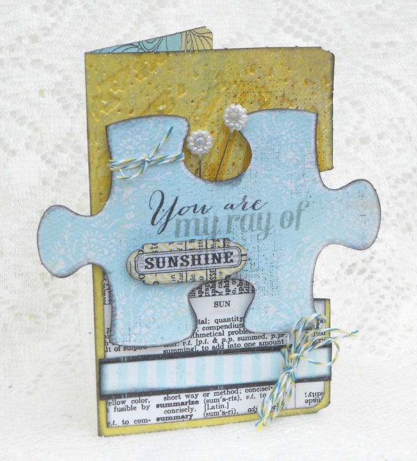 Items used for this card: Petite Folder, Puzzle Pieces, Hinges and Tabs from the Renew line, pearl pins, Queen & Co. twine, Sizzix Texture Fades embossing folder -Rays, Black Soot Distress Ink. The Card inside...Thanks for stopping in today! Be Inspired!